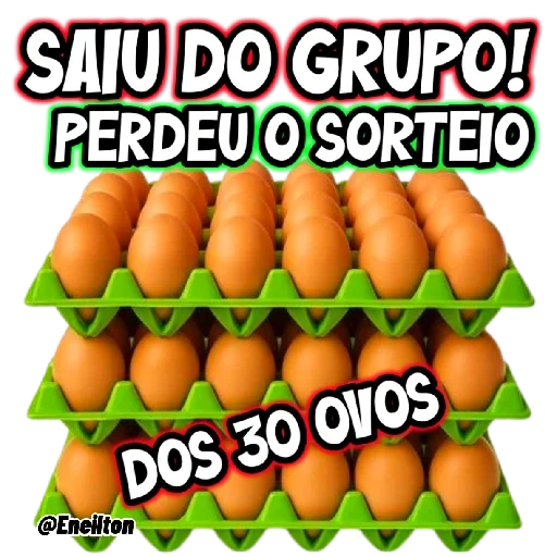 Una bandeja de huevos con tres hileras de huevos marrones en un envase verde. El texto 'SAIU DO GRUPO! PERDEU O SORTEIO DOS 30 OVOS' resalta en diferentes colores.