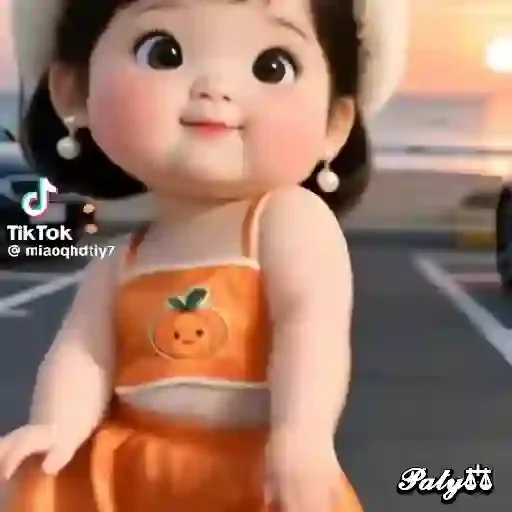 Menina de olhos grandes e cabelos pretos usando um vestido laranja com uma abóbora desenhada, em um cenário de rua ao…