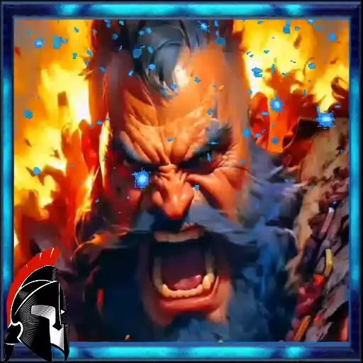 Rostro de un hombre con expresión de ira, boca abierta y ojos oscuros, en medio de llamas y efectos de luz azul.