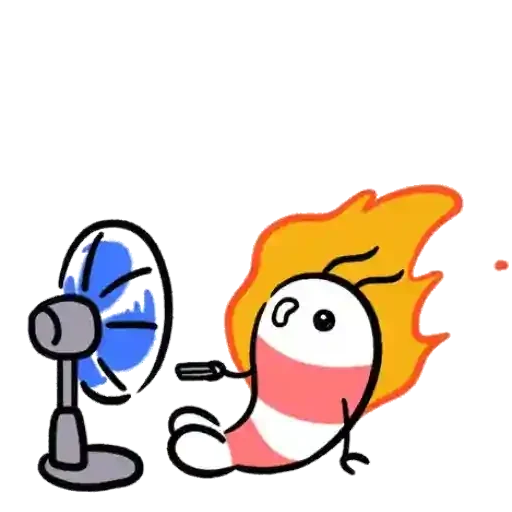 Un personaje de dibujo animado con cuerpo rayado en rojo y blanco, cabello naranja flameante, junto a un ventilador que sopla aire.