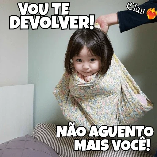Una niña con expresión de desaprobación o irritación siendo sostenida por una mano. El texto 'VOU TE DEVOLVER! NÃO AGUENTO MAIS VOCÊ!' aparece en la imagen.