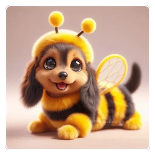 Un perro vestido con un traje de abeja, con sombrero y alas. El perro tiene ojos grandes y expresivos y parece feliz.