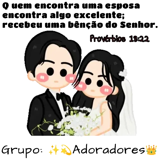Una pareja de novios, el hombre con traje negro y la mujer con vestido blanco, sosteniendo flores, con texto en español que dice 'Quien encuentra una esposa encuentra algo excelente; recibió una bendición del Señor. Proverbios 19:22'