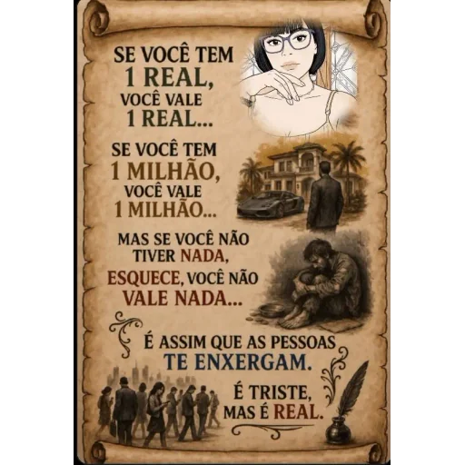 Un sticker con un pergamino antiguo, que contiene un texto motivacional en portugués. El texto habla sobre la autoestima y cómo las personas te ven. Hay imágenes de una mujer, una casa, una persona y un grupo de personas.