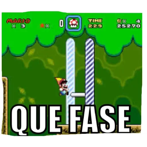 Captura de pantalla de un juego con Mario en un nivel difícil, texto 'QUE FASE' destacado.