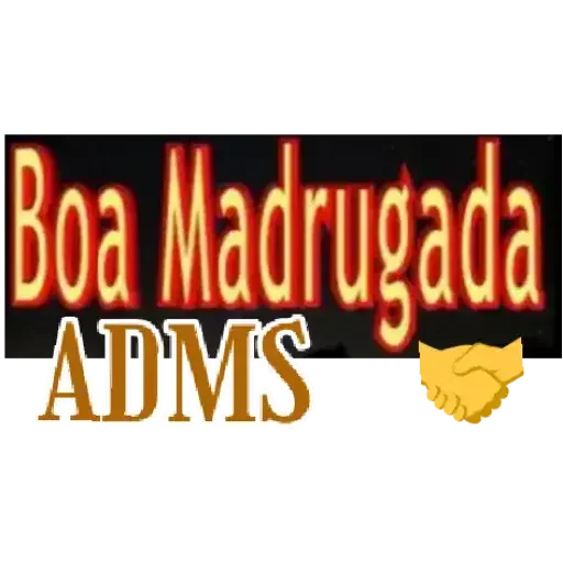 Un rectángulo negro con el texto 'Boa Madrugada ADMS' en letras doradas y rojas, acompañado de una pequeña imagen de un rostro.