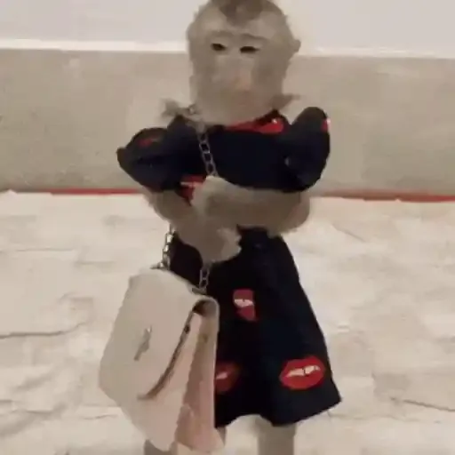 Un mono vestido con una falda negra con logotipos rojos y un bolso blanco, con expresión seria.