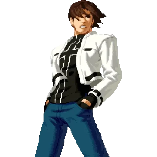 Personaje de anime con cabello marrón, usando una chaqueta blanca y pantalones azules.