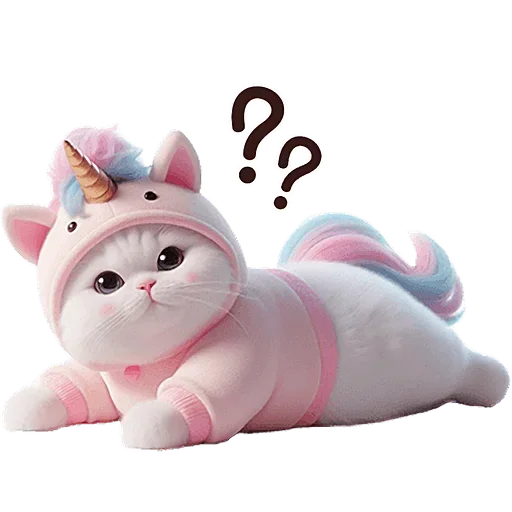 Gato blanco acostado con un disfraz de unicornio rosa con un cuerno dorado y una expresión confundida, con dos signos de interrogación arriba.
