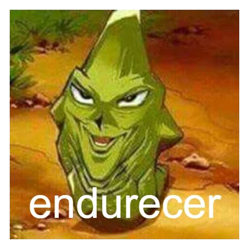 Un personaje verde, parecido a un cactus, con expresión facial seria y ojos oblicuos, sonriendo levemente. La palabra 'endurecer' está escrita debajo.