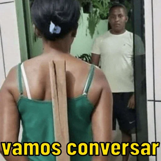 Mujer de espaldas, con un paño verde y un objeto en la espalda, mirando a un hombre sonriendo en el espejo. La leyenda 'vamos conversar' aparece en amarillo en la parte inferior.