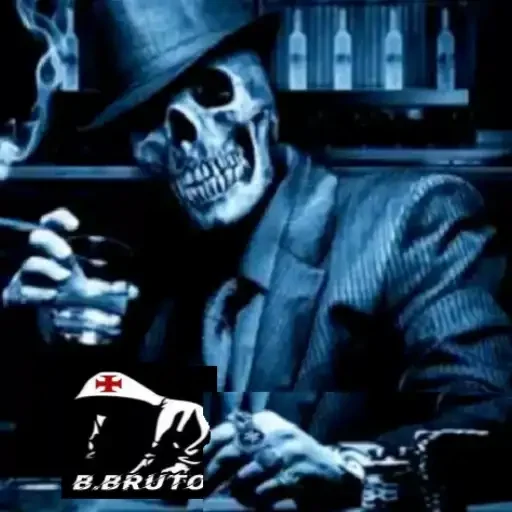 Esqueleto con sombrero, gafas de sol y traje, fumando y bebiendo en un bar. Fondo oscuro con botellas.