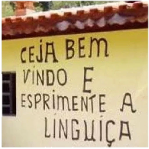Una pared amarilla con una teja roja en la parte superior, con el texto 'CEJA BEM VINDO E ESPRIMENTE A LINGUIÇA' escrito en letras negras.