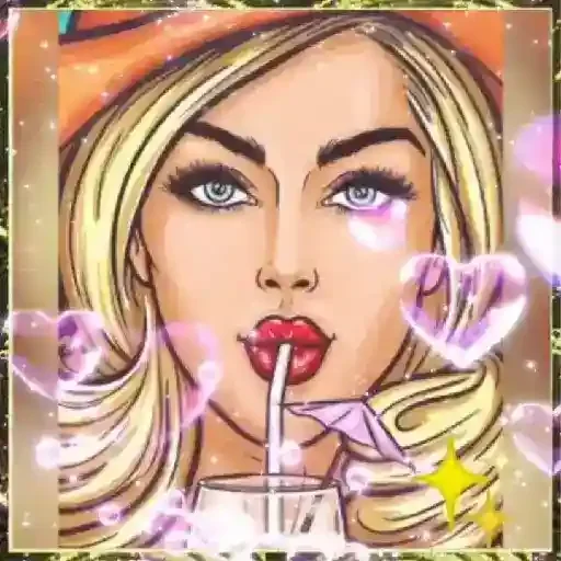 Una mujer rubia con un sombrero naranja y maquillaje colorido bebe de un popote, rodeada de corazones rosa y morados.