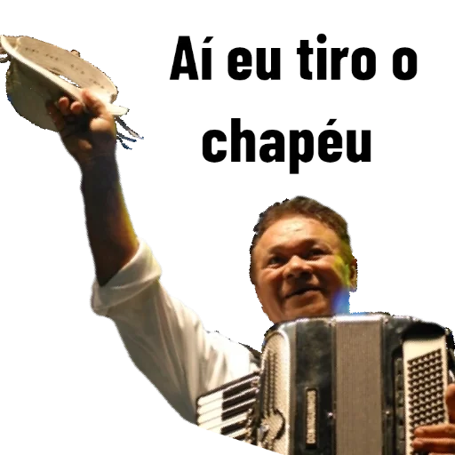 Hombre con un acordeón y un sombrero en la mano, sonriendo. El texto "Aí eu tiro o chapéu" está encima de él.