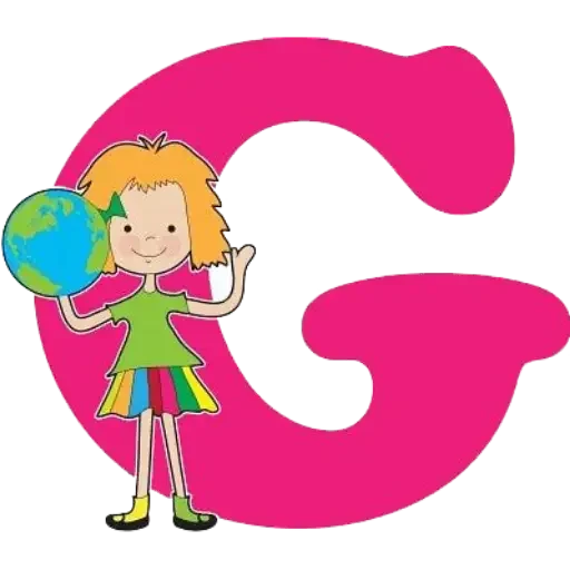 Niña de cabello naranja sostiene el globo terráqueo frente a una letra G rosa gigante.