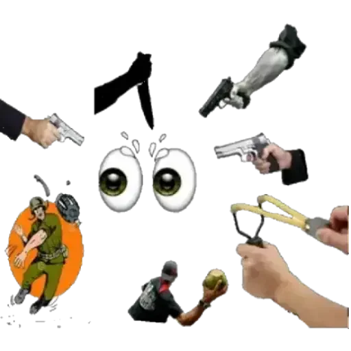 Una figurita divertida con varios elementos de armas y personajes en situaciones cómicas, incluyendo ojos muy abiertos de sorpresa.