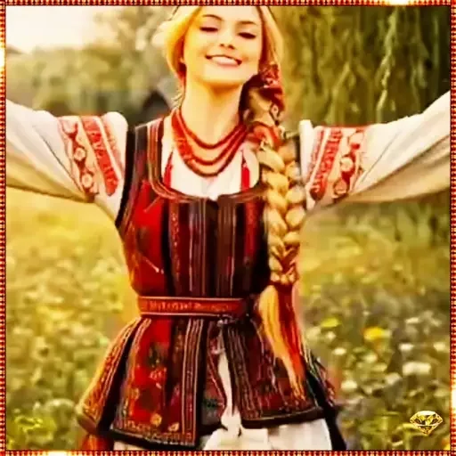 Mulher com os olhos fechados e sorriso, usando um lenço colorido na cabeça e um vestido tradicional, com texto 'В…