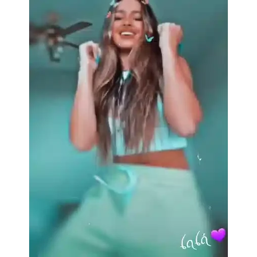 Una joven mujer con cabello marrón largo y uñas pintadas de verde, con las manos levantadas cerca de su rostro, pareciendo feliz o emocionada. Ella viste un atuendo verde claro y tiene un nombre 'Lala' escrito en la esquina inferior derecha.