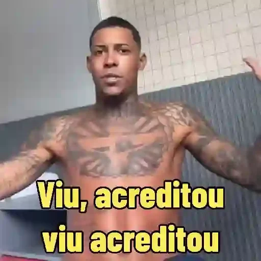 Homem tatuado com um laço rosa no cabelo, apontando para cima com a mão esquerda, com o texto 'idai fia' em branco na…