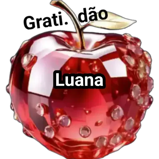 Una manzana roja brillante con gotas de agua, con el texto 'Grati. dão' arriba y 'Luana' en el centro.