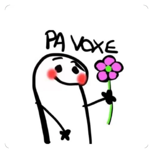 Um personagem de desenho simples com um sorriso tímido e bochechas rosadas segurando uma rosa vermelha.