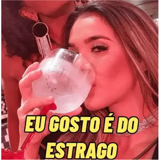 Una mujer con cabello castaño claro bebiendo de un vaso grande con la frase 'EU GOSTO É DO ESTRAGO' en letras amarillas.