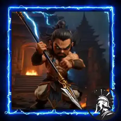Un guerrero con cabello negro y barba cerrada, vestido con armadura, empuña una espada con una hoja eléctrica. Está en una postura de lucha, con un fondo de templo o pagoda de noche.