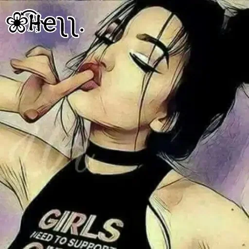 Una mujer con cabello negro y ojos marrones haciendo un gesto con la mano cerca de la boca, vestida con una blusa negra con la frase 'GIRLS NEED TO SUPPORT' escrita en blanco. El fondo es púrpura.
