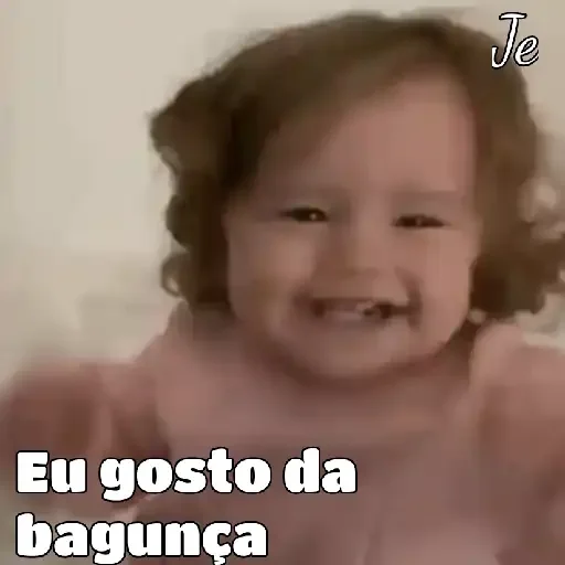 Niña con expresión feliz y cabello castaño, sonriendo, con el texto 'Eu gosto da bagunça' en blanco en la parte inferior.