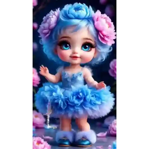 Boneca de cabelos loiros longos e ondulados, olhos azuis, vestida com um vestido roxo com flores brancas e um laço…