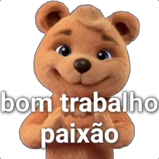 Un oso de peluche con expresión feliz y las manos juntas, con el texto 'bom trabalho paixão' superpuesto.