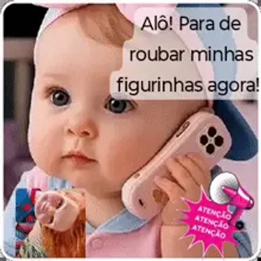 Un bebé con expresión seria, vestido con un sombrero y ropa colorida, sostiene un teléfono al oído. Texto superpuesto dice 'Alô! Para de roubar minhas figurinhas agora!'.