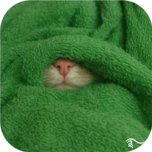 Un gato con la nariz rosa y bigotes blancos está cubierto por una manta verde peluda, con solo su cara visible.