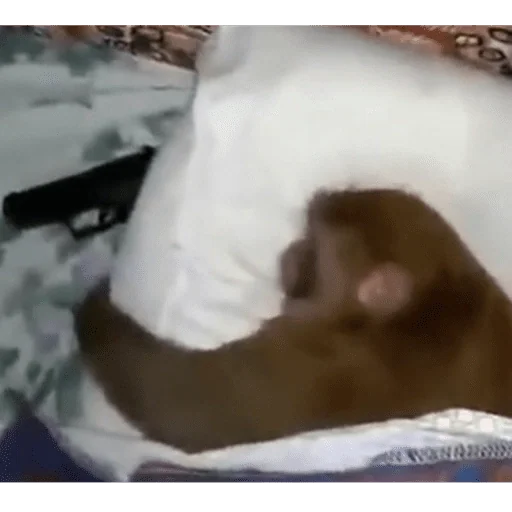 Um macaco nu carregando uma espingarda, parecendo confuso ou assustado.