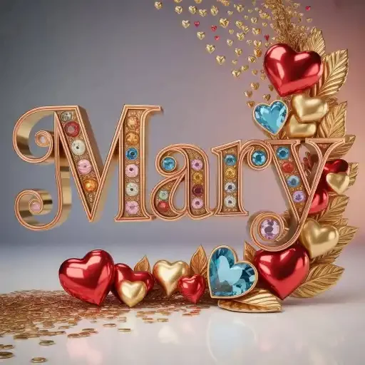 El nombre 'Mary' decorado con letras doradas, adornadas con joyas y corazones coloridos, incluyendo rojo, azul y dorado, en un fondo con efecto de luz.