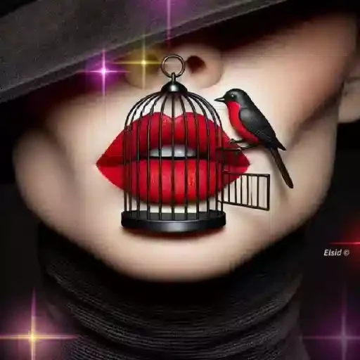 Rosto de mulher com batom vermelho e cabelo preto, olhando para o lado com uma mecha de cabelo na frente do rosto.
