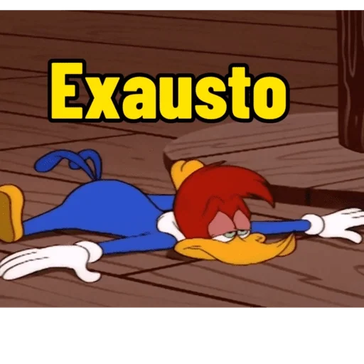 Un personaje de dibujos animados, probablemente Woody Woodpecker, acostado de espaldas en el suelo con una expresión de agotamiento. Tiene plumas rojas en la cabeza, cuerpo azul, piernas amarillas y guantes blancos. La palabra 'Exausto' está escrita en amarillo encima de él.