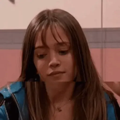 Uma jovem com cabelos castanhos e expressão de desinteresse ou tédio, vestindo uma blusa roxa.