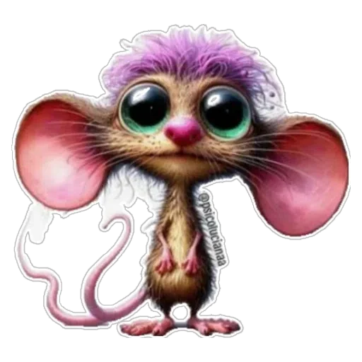Ratón de dibujos animados con orejas grandes y ojos verdes, pelo morado y cola larga.