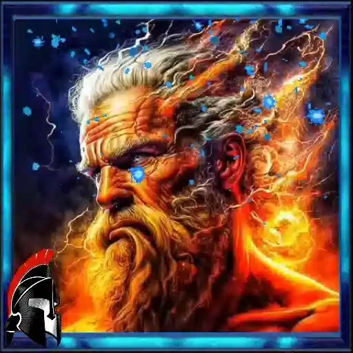 Rostro de un hombre anciano con cabello y barba largos y grises, ojos azules brillantes y expresión severa, rodeado de llamas y rayos azules.