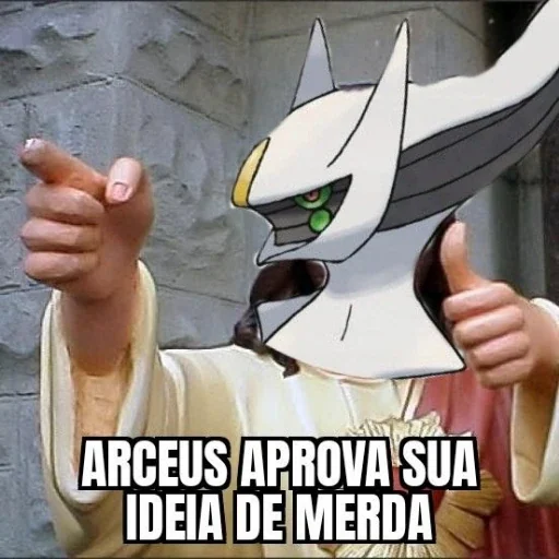 Un personaje de anime con una cabeza de monstruo blanco con cuernos y ojos verdes, vistiendo una ropa amarilla y apuntando hacia adelante con ambas manos. Debajo de él, dice 'ARCEUS APROVA SUA IDEIA DE MERDA'.