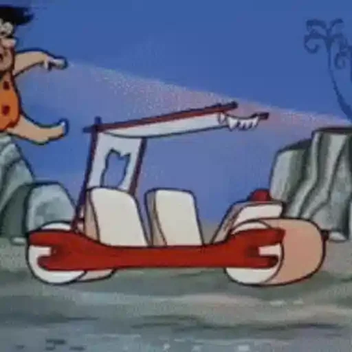 Personaje de dibujos animados corriendo junto a un vehículo prehistórico con una llave inglesa gigante.