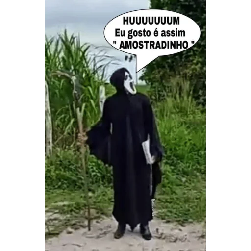 Un personaje con máscara blanca y ropa negra, con un azadón, en un entorno rural, diciendo 'HUuuuuuuum Me gusta así AMOSTRADINHO'.