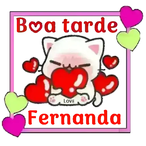 Un gatito blanco adorable con corazones rojos alrededor, ojos cerrados y un corazón grande delante de la boca. El texto 'Boa tarde Fernanda' está escrito en rojo.