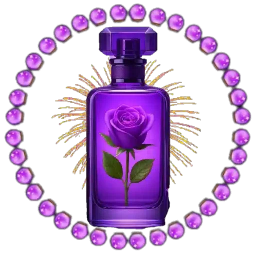Botella de perfume morada con una rosa morada y hojas verdes, rodeada de joyas moradas y rayos dorados.