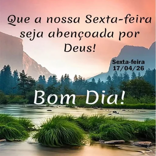 Un paisaje sereno de una montaña y un lago con el texto 'Que a nossa Sexta-feira seja abençoada por Deus!' y 'Bom Dia!' superpuesto.