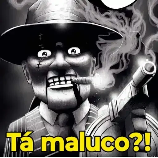 Un hombre con un sombrero, ojos desorbitados y un cigarro en la boca, pareciendo loco o poseído, con la frase 'Tá maluco?!' en amarillo en la parte inferior.