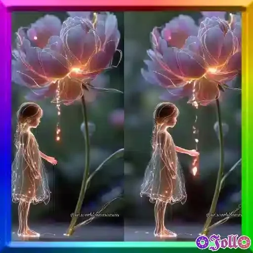 Una niña con vestido beige mira una flor púrpura gigante con detalles de fuego. Ella está en un entorno oscuro con un borde colorido.