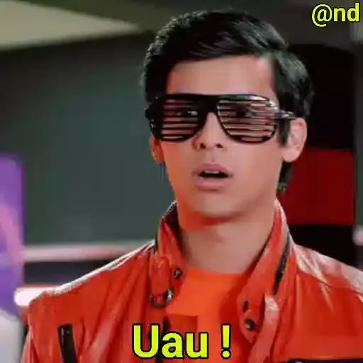 Un joven con cabello negro y gafas de sol, vistiendo una chaqueta naranja, con una expresión de sorpresa y la leyenda 'Uau!' en amarillo.